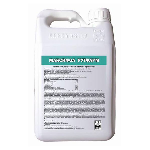 Максифол Рутфарм, 5 литров Максифол Рутфарм – специальный комплекс, содержащий экстракт водорослей Ascophyllum nodosum, специальные аминокислоты, макро- и микроэлементы, разработанный для развития боковых и дополнительных корней, обеспечивая равномерное развитие всей корневой системы растения.