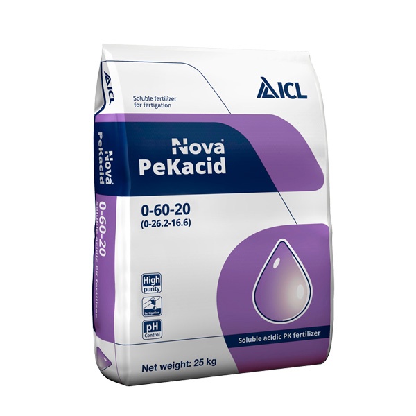 Nova PeKacid® 0-60-20, 25 кг — это высококонцентрированное водорастворимое удобрение от ICL, содержащее 60 % фосфора и 20 % калия. Отличается выраженным подкисляющим эффектом (pH ≈ 2,2).